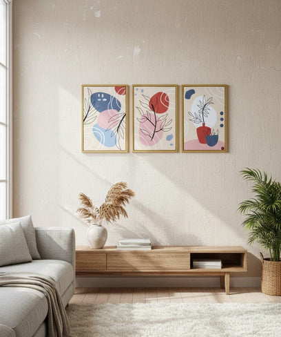 This modern wall art frame set blends abstract shapes with elegant leaf illustrations and soothing pastel tones. The balanced colors and artistic flow add a refreshing and stylish touch, making it perfect for living rooms, bedrooms, offices, or contemporary wall decor spaces.