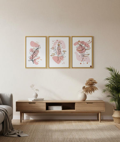 This modern wall art frame set features elegant leaf patterns with soft blush tones and minimal line details that bring a calm and artistic feel to living rooms, bedrooms, offices, or creative corners while enhancing wall aesthetics effortlessly.
