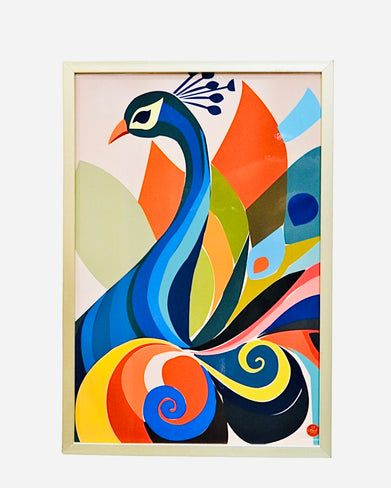 This abstract wall art frame features a graceful peacock formed with flowing shapes and vibrant color layers. The harmonious blend of curves and bold tones creates a lively visual movement, adding artistic charm and elegance to any wall space.