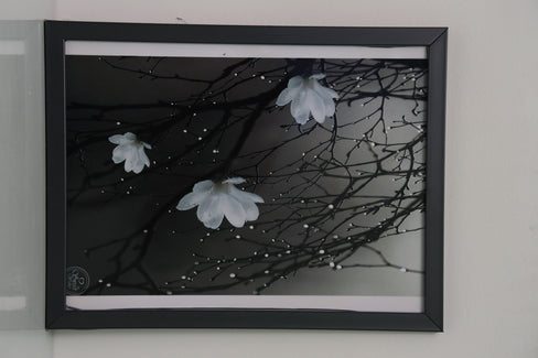 A breathtaking painting of a tree adorned with delicate white flowers, as shimmering water droplets fall gracefully from its branches and petals, mirroring the beauty of a gentle rain. This enchanting artwork captures the purity and serenity of nature, making it a stunning addition to any space.