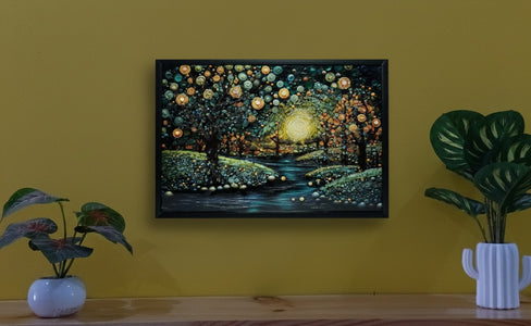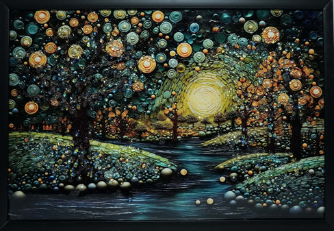 The Celestial River of Light crystal glass wall frame is a beautiful fusion of art, texture, and depth. Featuring intricate circular patterns, glowing elements, and a calm flowing river, it creates a magical nightscape that instantly enhances your space. Made with high-definition crystal glass, the artwork reflects light elegantly, offering a luxurious, almost 3D effect. Its rich tones of deep blues, earthy greens, and warm gold make it a perfect statement piece for modern homes, offices, cafés, or as a thoughtful gift that tells a story.
