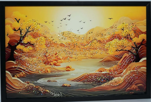 Elevate your décor with this crystal glass wall frame showcasing a serene golden autumn landscape. Embellished with sparkling crystal accents and crafted from premium glass, this 14 x 20-inch framed artwork adds warmth, elegance, and artistic charm to any living or work space.