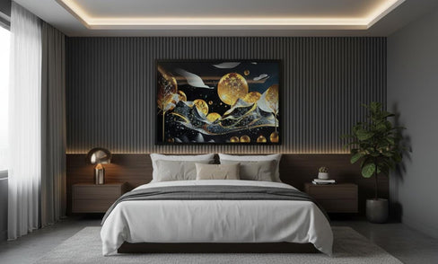 This crystal glass wall frame features an elegant abstract nature design highlighted with golden elements and flowing textures. The crystal-clear glass finish enhances depth and shine, while the premium framing adds durability and a sophisticated, modern touch to any interior space.