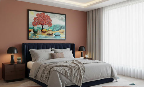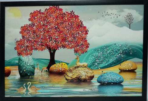 This crystal glass wall frame features a vibrant, scenic artwork with a blooming tree, calm water, and graceful nature elements. The crystal-clear glass finish enhances depth and shine, while the sturdy frame adds a premium, elegant touch to your decor.