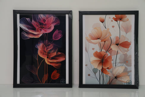 A stunning set of two frames showcasing the timeless beauty of flowers in contrasting themes. One frame features a delicate, light-toned floral painting, radiating softness and elegance, while the other presents a bold, dark-themed floral artwork, exuding depth and mystery. Together, they create a perfect balance of grace and intensity, making them an exquisite addition to any space.