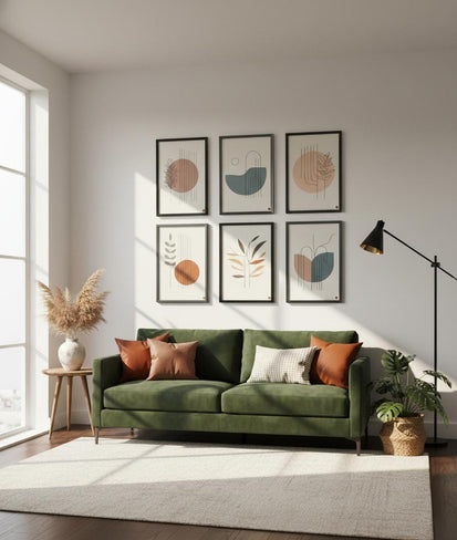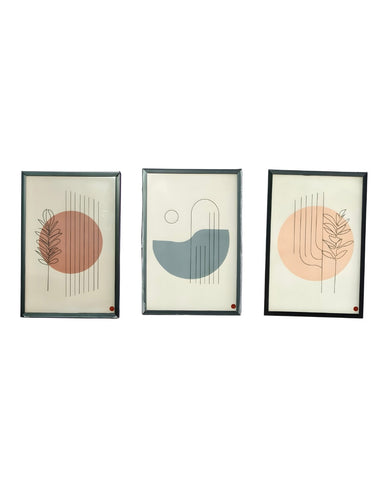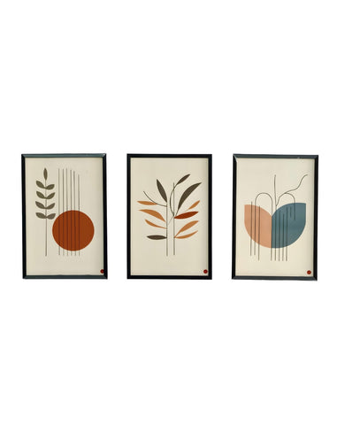 This modern art wall frame set features elegant leaf patterns combined with soft geometric shapes and earthy tones, creating a calm, balanced look that enhances living rooms, bedrooms, hallways, or office spaces with a stylish and soothing wall decor appeal.