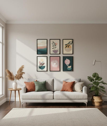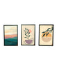 This modern art wall frame set showcases calm nature-inspired shapes with sun leaves and soft landscapes in soothing pastel and earthy tones, creating a balanced and elegant look that enhances living rooms, bedrooms, offices, or creative spaces beautifully.