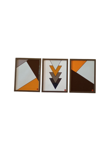 A bold fusion of geometry and color, this set of three frames features striking triangular patterns and arrow-like structures in vibrant shades of yellow, brown, and more. Perfect for adding energy and modern flair to any space.