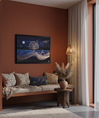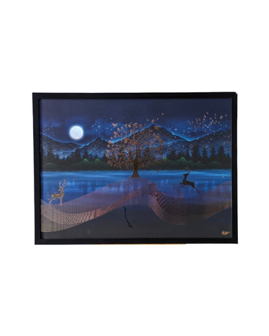 This exquisite framed artwork features a mesmerizing midnight landscape, blending shimmering golden accents with deep indigo hues. Depicting a majestic tree, graceful deer, and a glowing moon, it adds a touch of modern luxury and tranquil elegance to any interior space.