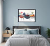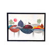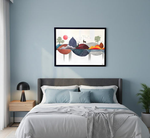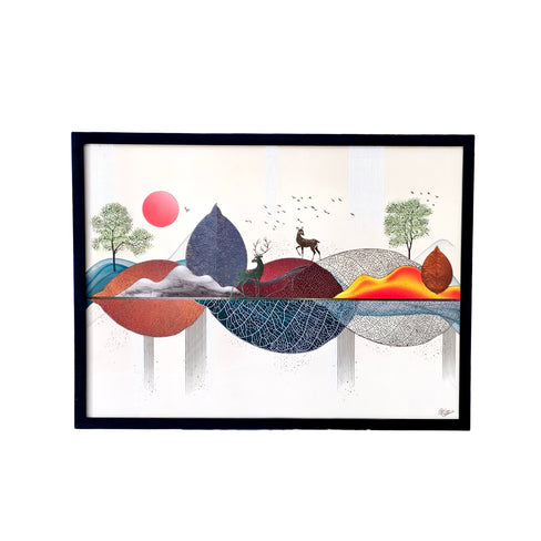 This golden art frame presents a harmonious landscape of hills, trees, and wildlife with flowing textures and warm accents, creating a calm yet artistic visual that enhances contemporary interiors with depth, elegance, and natural charm.