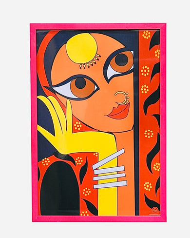 This elegant Madhubani wall art showcases a graceful woman portrait inspired by traditional Indian folk art. Rich colors, bold expressions, and intricate detailing make it a perfect choice to add cultural charm to modern and ethnic interiors.