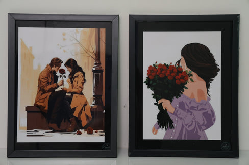 A beautifully paired set of two frames symbolizing romance and heartfelt emotions. One frame captures a loving couple, embracing their bond, while the other showcases a graceful girl holding a bouquet of red roses, representing love, longing, and admiration. This stunning set adds warmth and elegance to any space, making it perfect for celebrating love in all its forms.