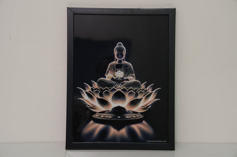 A mesmerizing glowing frame of Buddha seated gracefully on a lotus, holding a radiant lotus in hand. The black and glowing effect enhances its divine presence, symbolizing peace, wisdom, and enlightenment. A perfect masterpiece to bring tranquility and elegance to any office, hotel, or sacred space