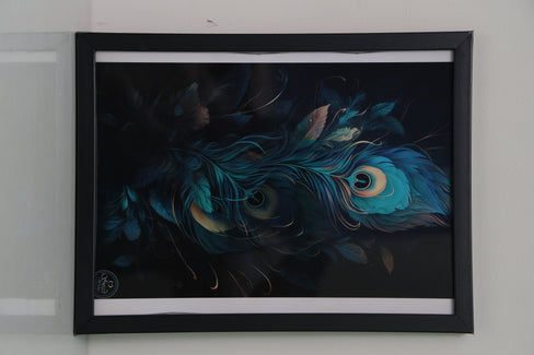 A mesmerizing frame showcasing the exquisite beauty of peacock feathers in a stunning blue theme. With intricate details and a radiant glow, this artwork symbolizes grace, elegance, and spiritual harmony, making it a perfect statement piece for any space.