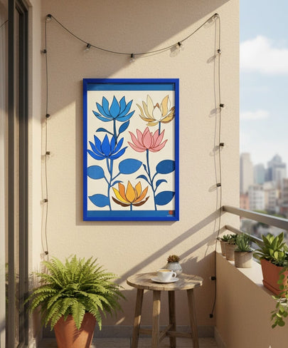 Add a touch of contemporary elegance to your home with this vibrant Pichwai-inspired lotus artwork. Featuring bold, stylized blooms in striking blue, pink, and orange tones, this high-quality print is beautifully encased in a sleek blue frame to enhance any modern interior.