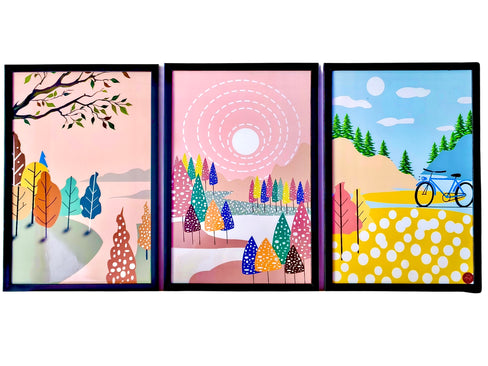 Brighten your space with this charming set of three scenic landscape art frames featuring playful trees, soft pastel tones, and a serene outdoor theme. The vibrant colors and contemporary design create a cheerful yet stylish focal point for modern homes, bedrooms, offices, or creative spaces.