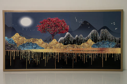 A mesmerizing nightscape featuring a radiant red tree standing against majestic blue and brown mountains under the luminous glow of a full moon. With a shimmering appearance, this artwork captures the magic of nature, making it a stunning centerpiece for any space!