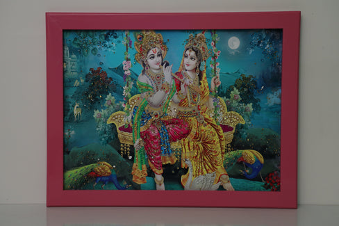A mesmerizing, shining photo frame capturing the eternal love of Radha and Krishna as they gently sway on a jhula beneath a grand tree. Bathed in the soft glow of the full moon, this enchanting artwork radiates peace, romance, and divine beauty—perfect for adding a touch of spirituality and elegance to any space