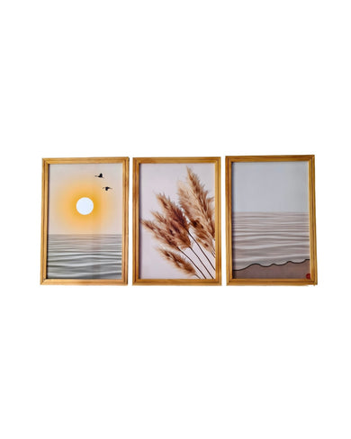 This wall art frame set features calm scenic visuals with a soft sunrise view gentle waves and dried grass elements that create a peaceful and relaxing atmosphere while adding warmth and elegance to living rooms, bedrooms, or office spaces.