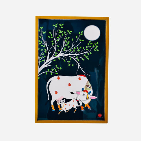 Invite blessings into your home with this beautiful depiction of a cow and calf under a moonlit tree. Housed in a luxury gold-finish frame made from high-end synthetic composites, this piece is as durable as it is visually striking.