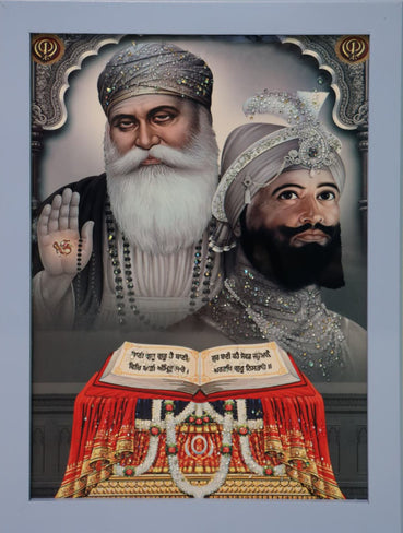 A powerful and divine artwork featuring a revered Sikh Guru alongside a noble king, both in the presence of the holy scripture. This masterpiece symbolizes wisdom, faith, and leadership, radiating spiritual strength and reverence in every detail.