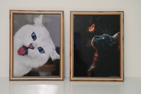 A charming set of two frames celebrating the beauty and mystery of cats. One frame features an adorable white kitty with an innocent and playful expression, while the other showcases a sleek black cat gazing upward at a delicate butterfly hovering just above its nose. This delightful duo adds a touch of elegance and curiosity to any space, making it a perfect choice for cat lovers and art enthusiasts alike.