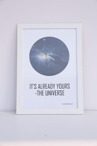 A sleek white rectangular portrait frame featuring an inspiring thought paired with a captivating universe-themed image. Perfect for office walls, this frame adds a touch of elegance and motivation, creating a serene and thought-provoking workspace atmosphere.